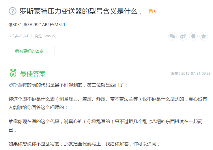 羅斯蒙特的表的代碼是最不好觀測的,第二位就是西門子;你這個即不說是什么表(測量壓力、差壓、靜壓、帶不帶法蘭等)也不說是什么型式的,真心沒有人能夠給你回答這個問題的;就像你現(xiàn)在寫的這個代碼,說真心的(你是亂寫的)只不過把幾個亂七八糟的東西拼湊在一起而已;如果你想說你不是亂寫的,那就把全代碼寫上,我給你解答,你可以追問;